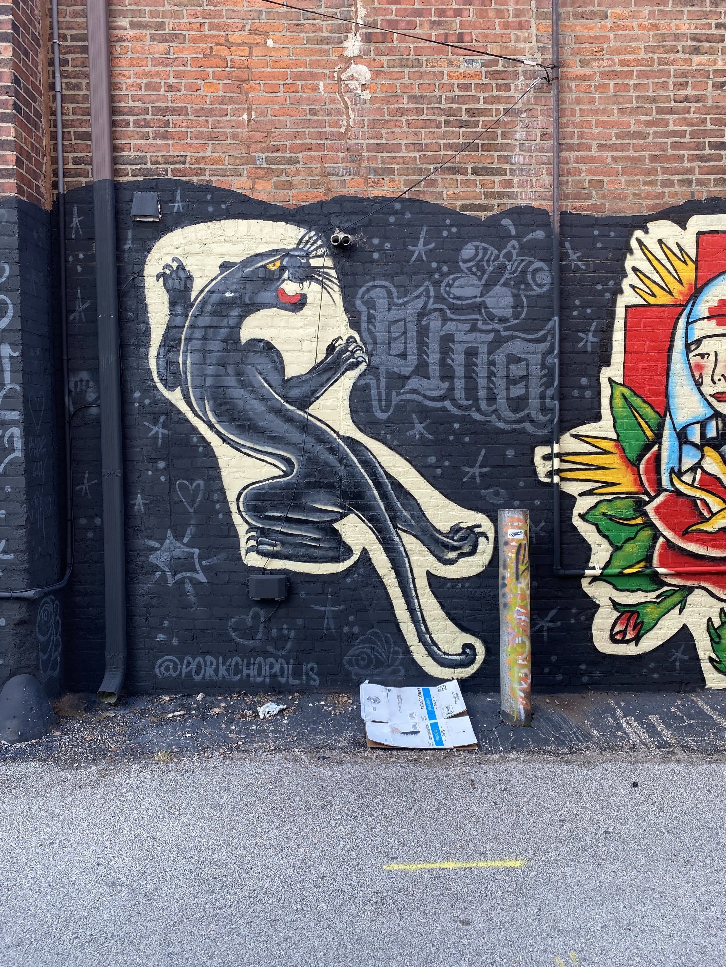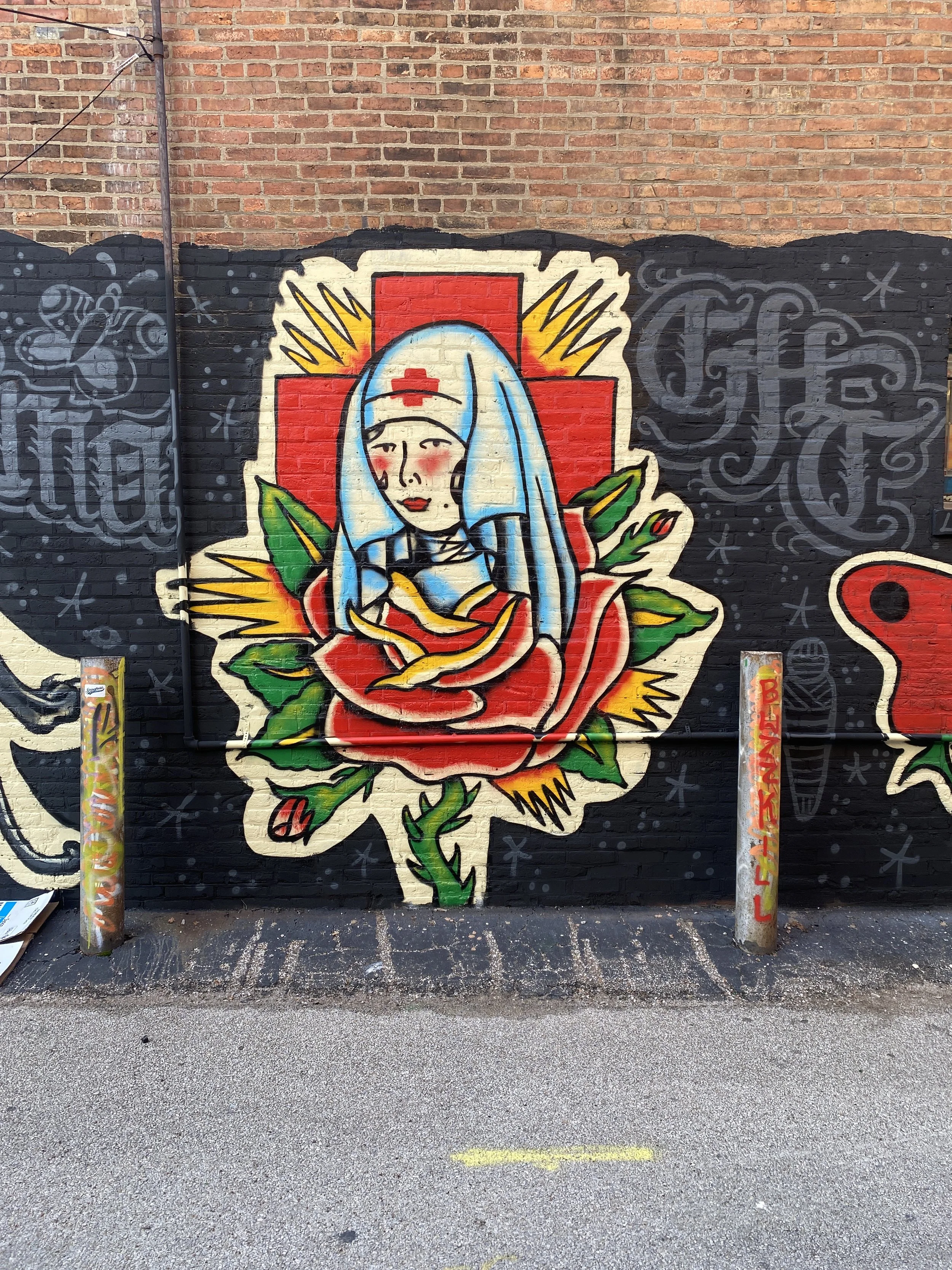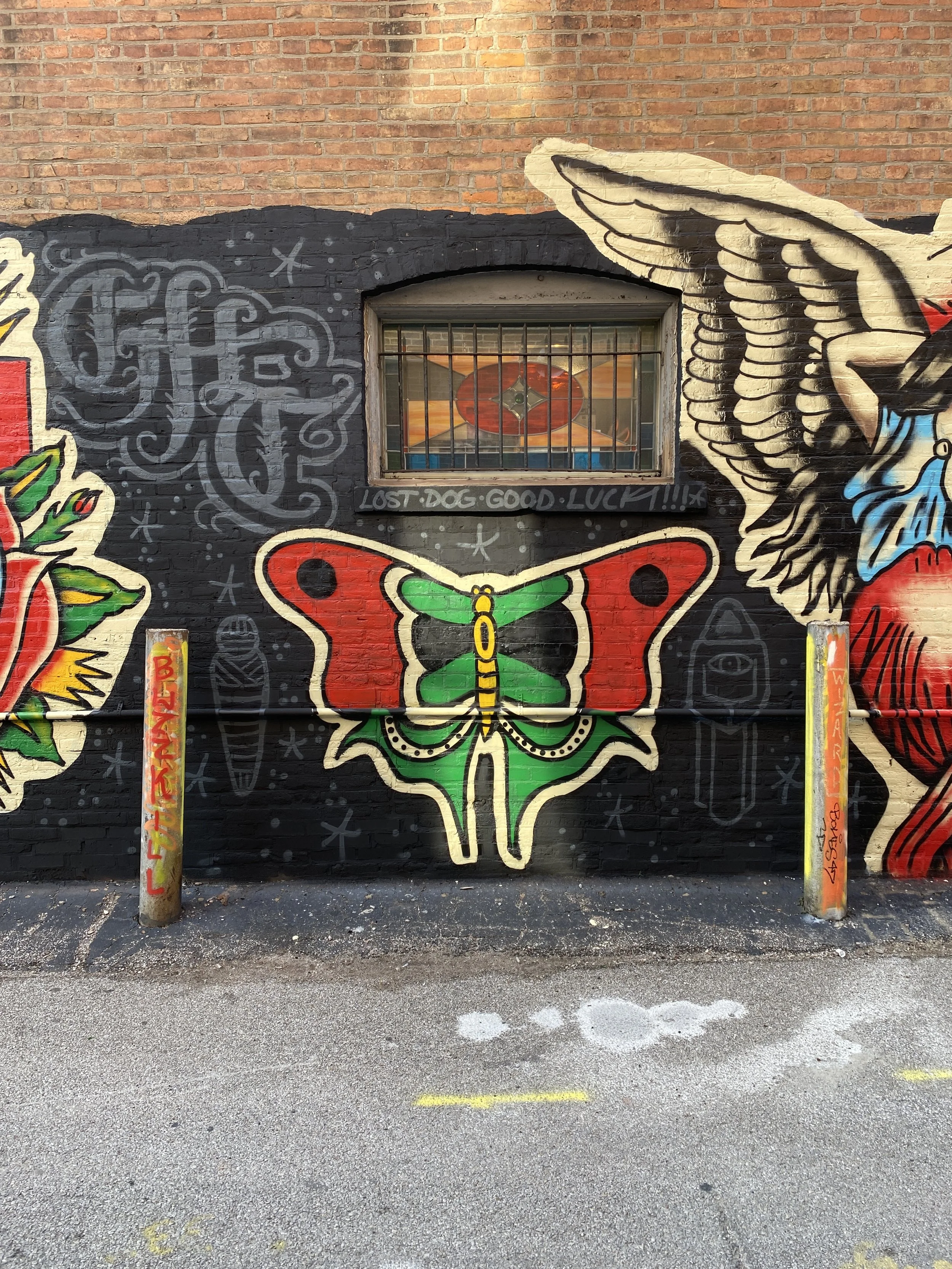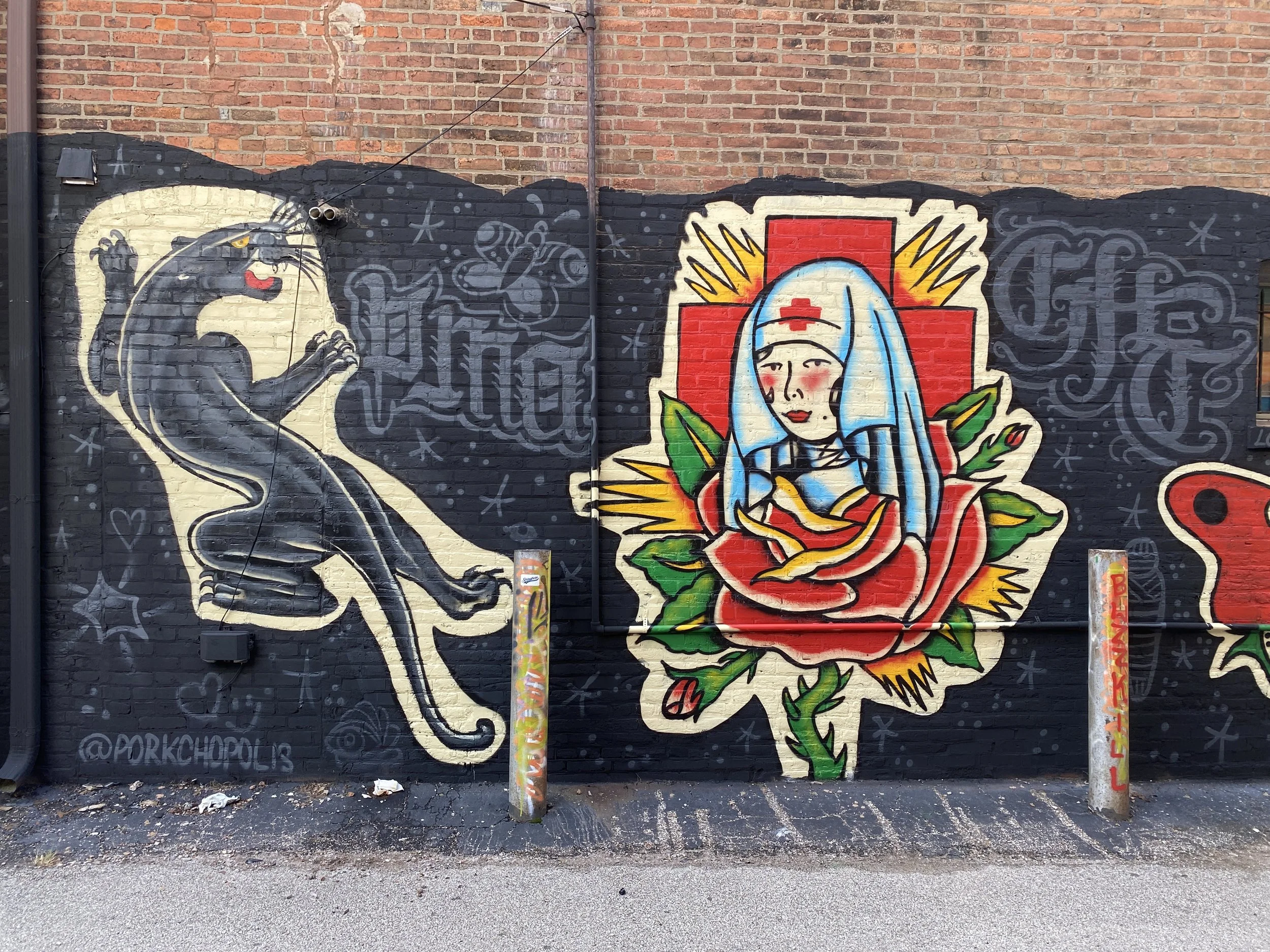 Completed in by Lyndsay and Spencer Stokes over multiple stages. Located at 414 E Monroe St, Springfield, IL 62701. Inspired by the art we love most with a heavy dose of traditional tattoo designs.